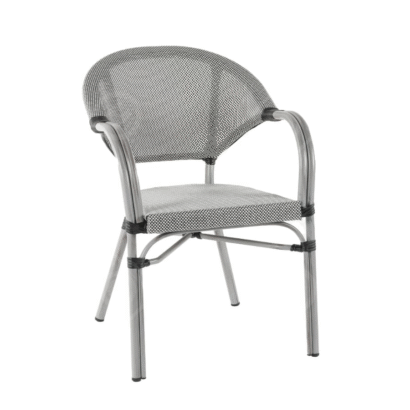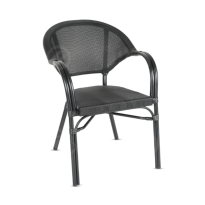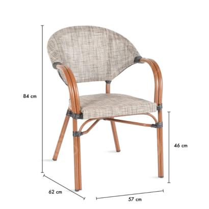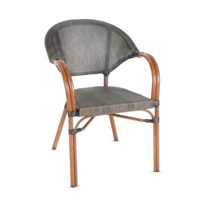 כיסא בסגנון ראטן, עשוי אלומיניום בציפוי דמוי עץ. מתאים לפנים וחוץ, עשוי מחומרים עמידים. העיצוב המעוגל נותן תמיכה לגב ובכך גורם לנוחות מירבית. הכיסא יגרום ללקוחות שלך להזמין יותר.